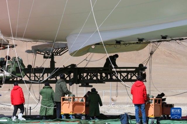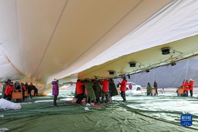 科考队员为“极目一号”Ⅲ型浮空艇加装载荷(5月12日摄)。